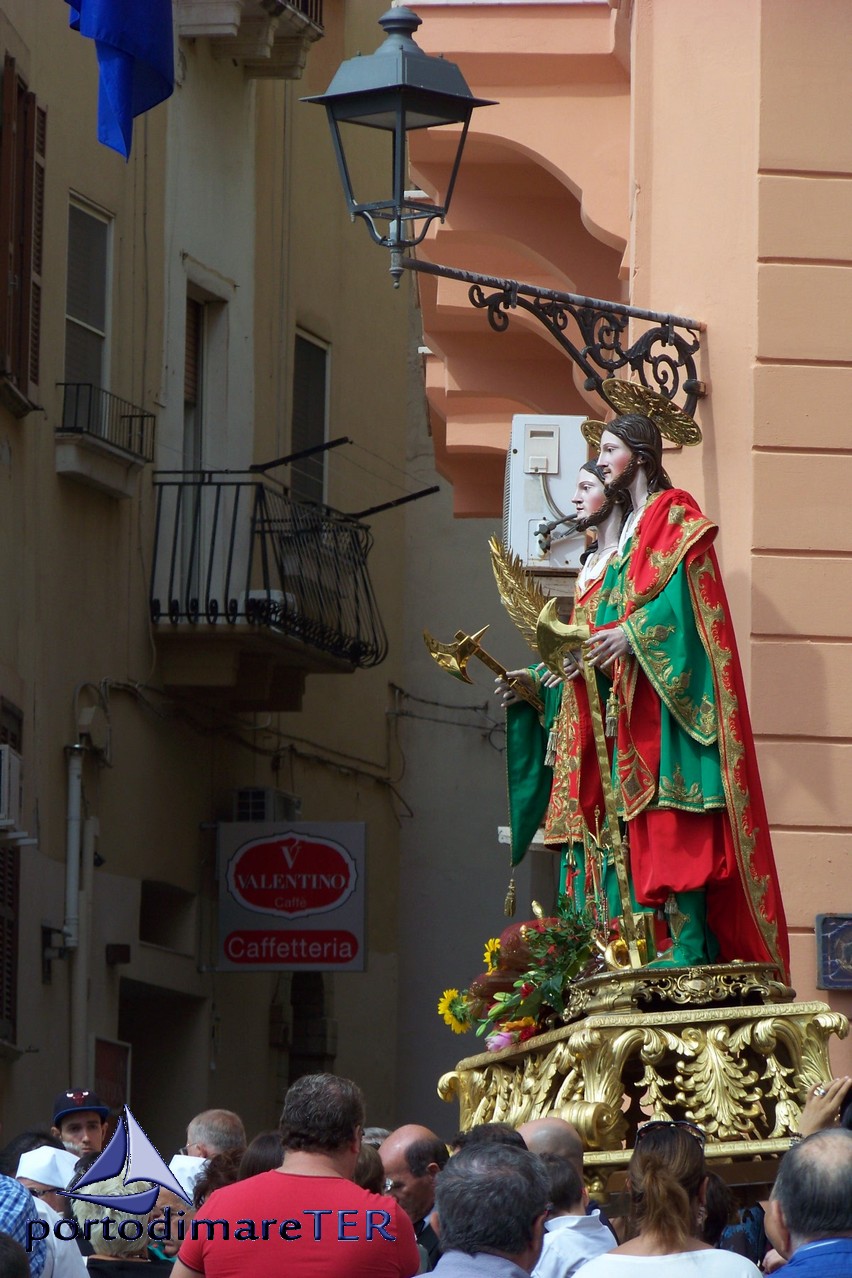 La processione dei Santi Medici percorre il pendio Lariccia per raggiungere piazza Castello. Davanti alla casa di Sant'Egidio, ad attendere il passaggio della processione, una rappresentanza della Confraternita intitolata al Santo tarantino.